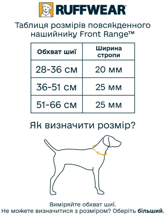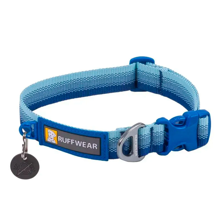 У цей нашийник вбудовані характерні елементи бренду Ruffwear: алюмінієве кільце V-подібне для кріплення повідця, окрема точка для кріплення ідентифікаційного жетону, силіконовий фіксатор, а також міцна і зручна стропа, що зберігає колір.