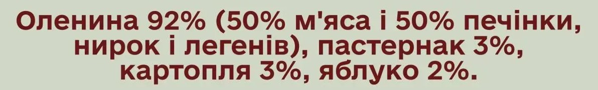 Cooka's Cookies "92% Оленина з овочами та фруктами" – це високоякісний вологий корм, виготовлений на основі 92% оленини, яка є відмінним джерелом білка, необхідного для здоров'я та активності вашого улюбленця.