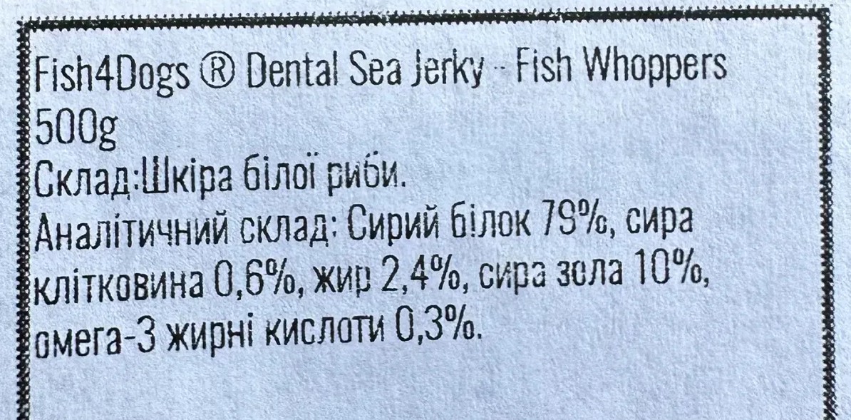 Розмір ласощів Sea Jerky Fish Whoppers — приблизно 100–200 мм завдовжки і близько 15 мм завтовшки (розмір може трохи змінюватись).