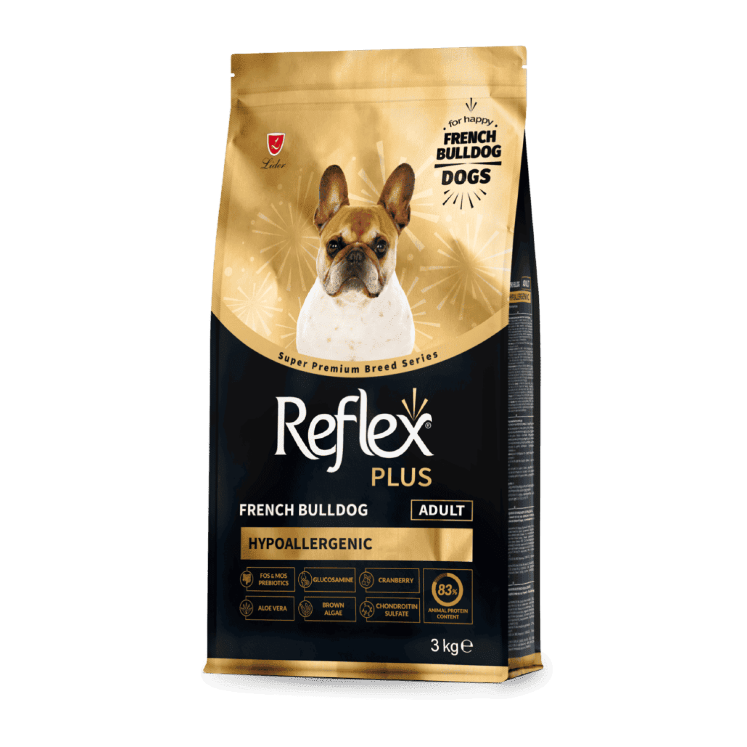 Reflex Plus French Bulldog Adult - це повноцінний та збалансований сухий корм супер-преміум класу, розроблений з урахуванням особливих потреб собак породи французький бульдог віком від 10 місяців.