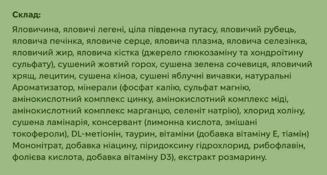 До складу входять 90% сирого м'яса яловичини, органів та риби, зібраних на екологічно чистих фермах та узбережжях Нової Зеландії.