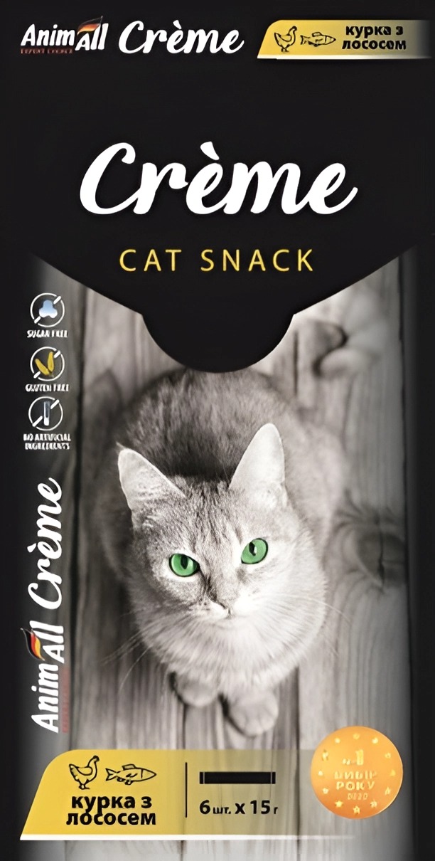 Нова лінійка ласощів AnimAll Сrème- це смачний дієтичний додаток до раціону Вашого котика.З AnimAll Сrème у Вас є чудова можливість порадувати Вашого улюбленця смачними та корисними ласощами. Снеки виготовлені зі свіжої курячої грудки та м'яса лосося, мають кремообразну текстуру в стіках, які зручно давати котику під час годування.