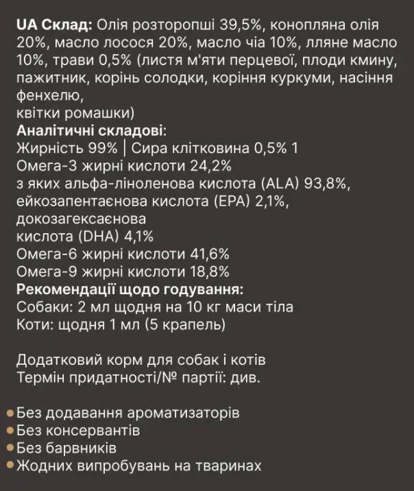 Це масло містить омега-3, омега-6 та омега-9 жирні кислоти, що робить його ідеальним для підтримки здоров'я вашого вихованця.