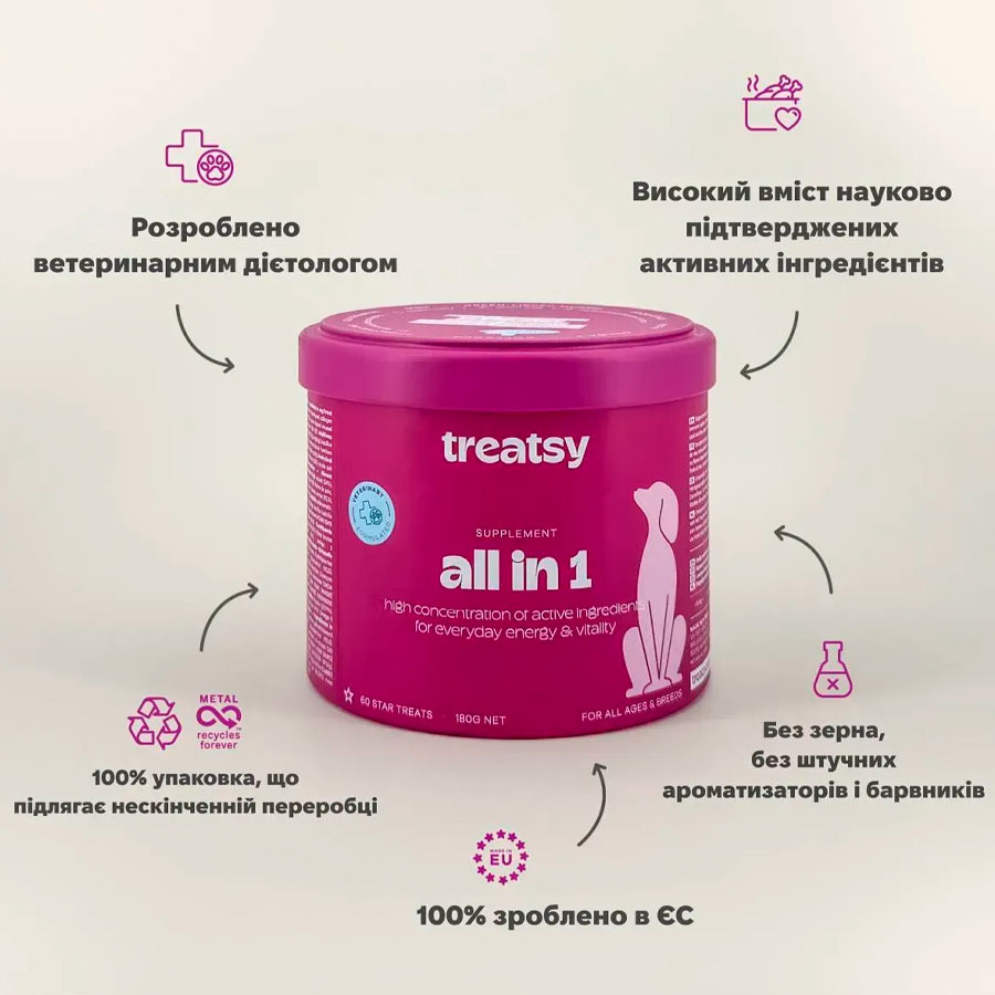 Treatsy All in 1 -ndash; це ефективний спосіб забезпечити своєму вихованцю необхідні поживні речовини для підтримки його здоров'я та благополуччя.