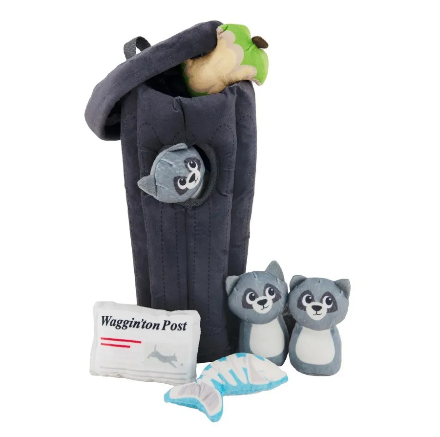 - Увлекательные плюшевые находки: игрушка содержит 6 элементов — 3 енота, огрызок яблока, газету и рыбный скелет, каждый из которых оснащен пищалкой для дополнительного интереса.