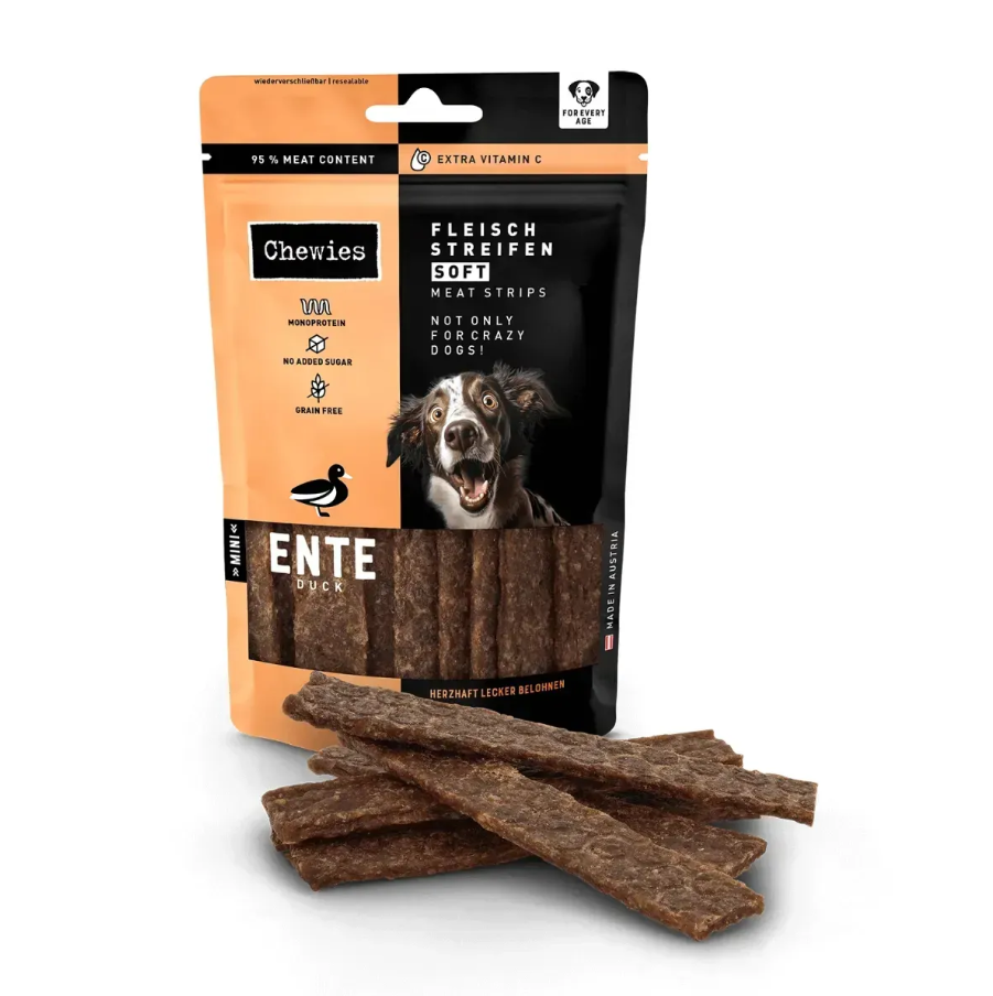 С Мясными полосками Chewies® Soft Ente вы радуете свою собаку неотразимым угощением. 95 % бережно высушенного мяса дарят насыщенный вкус – идеально для маленьких моментов радости или как ценное поощрение каждый день.