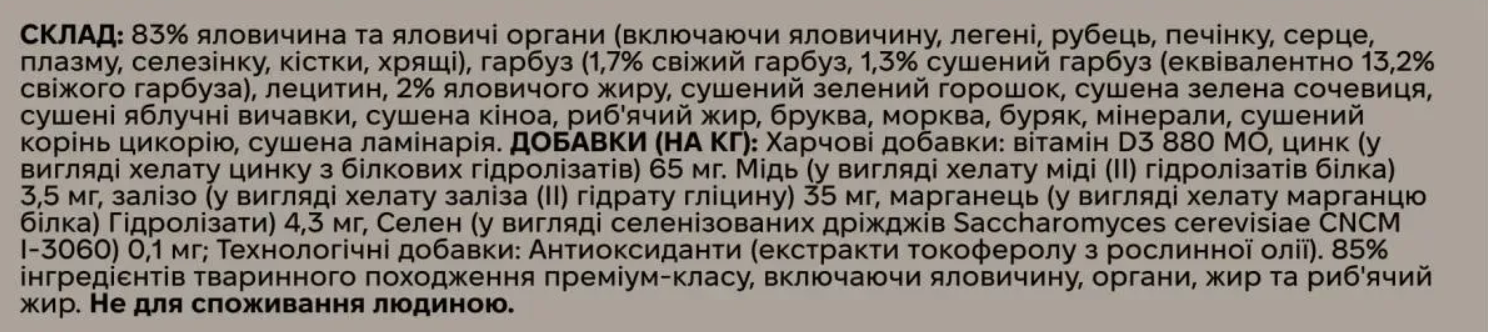 Созданный на основе 85% премиального мяса и органов говядины, выращенной на зеленых пастбищах Новой Зеландии, этот корм содержит также тыкву и корень цикория для поддержания здорового пищеварения.
